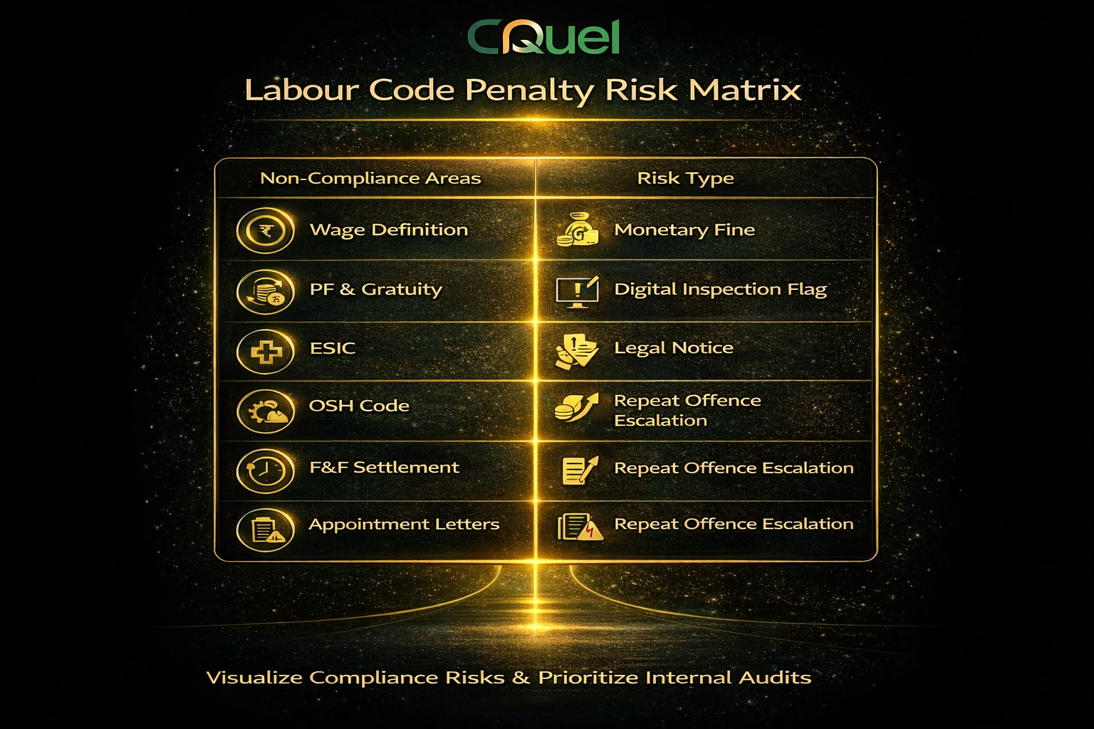 Non-compliance with wage definition, PF deposits, OSH standards, or F&F timelines can trigger penalties.